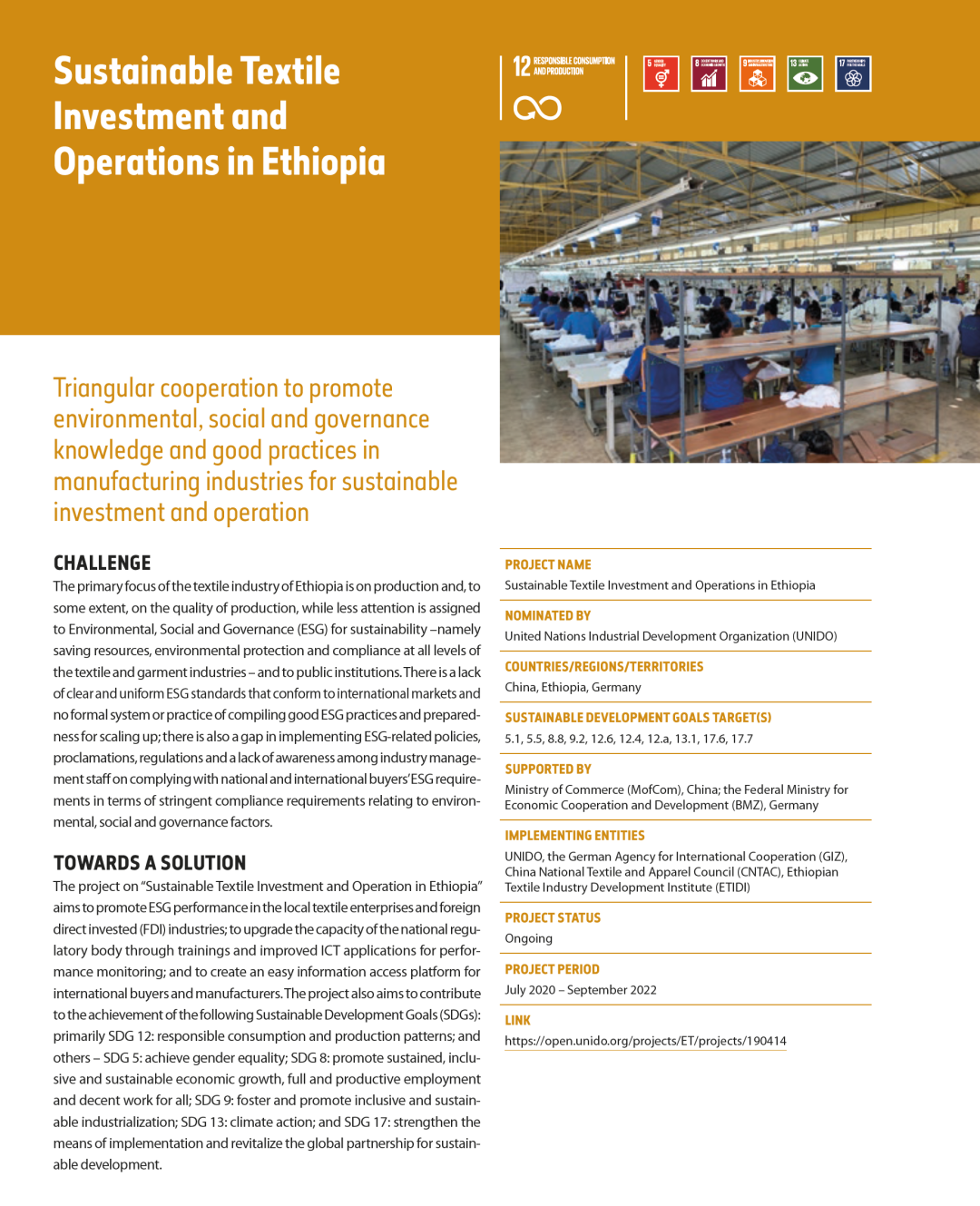 埃塞項目是在中國、德國和埃塞俄比亞三國關于“埃塞俄比亞可持續紡織業投資與運營”三方合作框架下,由中國紡織工業聯合會(CNTAC)、聯合國工業發展組織(UNIDO)、德國國際合作機構(GIZ)和埃塞俄比亞制造業發展研究院(EMIDI)合作執行,旨在提高埃塞俄比亞紡織服裝企業的環境、社會和治理(ESG)績效,并提升行業的可持續發展能力。具體分為基線調研、能力建設和經驗推廣三大階段。 自2020年9月起,中國紡聯社會責任辦公室聯合EMIDI和UNIDO,組建聯合團隊開展調研工作。調研對象覆蓋15家在埃塞俄比亞運營的中資紡織服裝企業、15家埃塞俄比亞當地企業與其他非中資的外資紡織服裝企業、國際品牌企業,以及埃塞工業園區發展公司(IPDC)、埃塞投資委員會(EIC)及重要非政府組織等利益相關方,以多方合作的伙伴關系視角,深入探究在埃塞俄比亞運營的紡織服裝企業的環境、社會和治理(ESG)現狀,以及“新冠”疫情對當地產業的影響。
