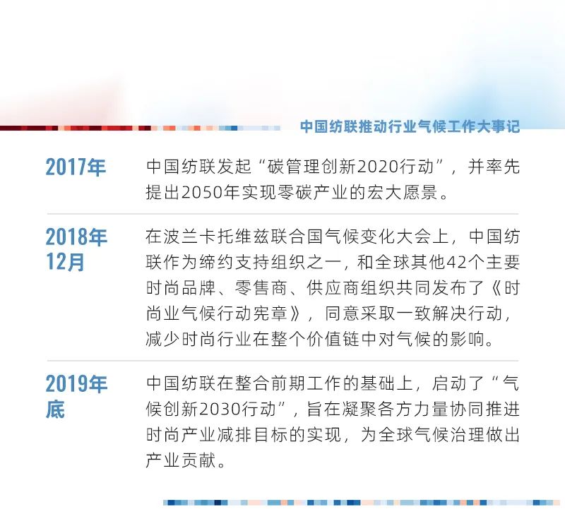 2020年9月22日中國宣布2030碳達峰2060碳中和戰略目標,次日中國紡織工業聯合會秋季聯展全面推進氣候創新行動,第一時間響應國家雙碳戰略目標。2021年6月1日中國紡織工業聯合會正式啟動了“中國時尚品牌氣候創新碳中和加速計劃”,簡稱“30·60碳中和加速計劃”,目前21家品牌企業,42家制造企業陸續加入,支持綠色低碳技術研發推廣和應用,全面推進可信低碳產品、支持可持續消費,共同推進行業氣候行動。