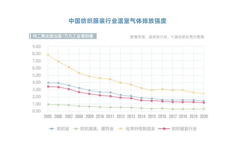 從排放強度來看,中國紡織服裝行業排放強度連年下降,行業綠色轉型成果顯著。2005-2020年行業排放強度累計下降超60%,“十三五”期間共下降16%。三個子行業碳排放強度均呈下降趨勢,化學纖維制造業2005-2020年累計降幅接近70%;紡織業排放強度2005-2020年累計降幅63%;紡織服裝、服飾業排放強度2005-2020年累計降幅接近65%。